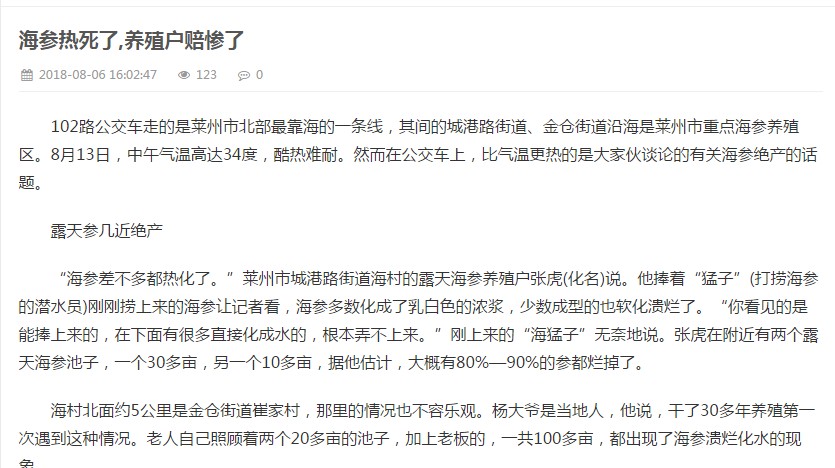 高壓鼓風(fēng)機(jī)用在水產(chǎn)養(yǎng)殖中,微孔曝氣效果怎么樣呢,前幾天看到一新聞,讓人挺心痛的,海參因?yàn)槌掷m(xù)的高溫天氣,而導(dǎo)致大量的死亡,讓我們明白一個(gè)道理,搞不產(chǎn)養(yǎng)殖的真心是不容易啊,大家可以看下這些新聞。