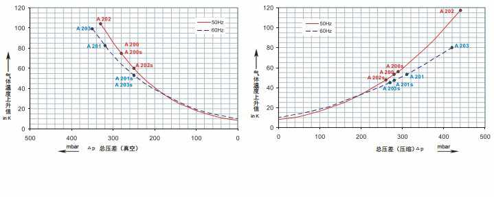該型號高真空度為負320mbar,高正壓為420mbar,上圖中橫軸為壓力情況,縱軸為對的某壓力下的溫升情況。